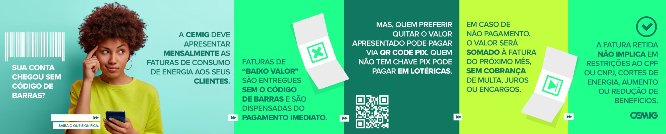 A Cemig, em conformidade com a regulação vigente, pode emitir faturas consideradas “de baixo valor” sem o código de barras para pagamento. Os valores das faturas de baixo valor serão somados/acumulados às faturas dos meses seguintes (faturamentos subsequentes). Sobre essas contas que serão acumuladas à próxima fatura não são cobrados juros ou multas.