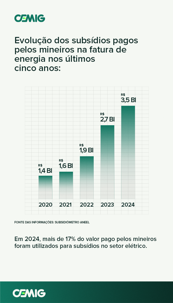 De acordo com o relatório subsidiômetro da Aneel, 17,33% do preço da última fatura dos clientes da Cemig Distribuição era destinado a subsidiar outros consumidores, especialmente, os de Geração Distribuída (GD). No ano passado, de acordo com a ferramenta do órgão regulador do sistema elétrico, os clientes da empresa pagaram R$ 3,5 bilhões em subsídios na conta de luz, o que representa um aumento de 29,63% em relação ao ano anterior.