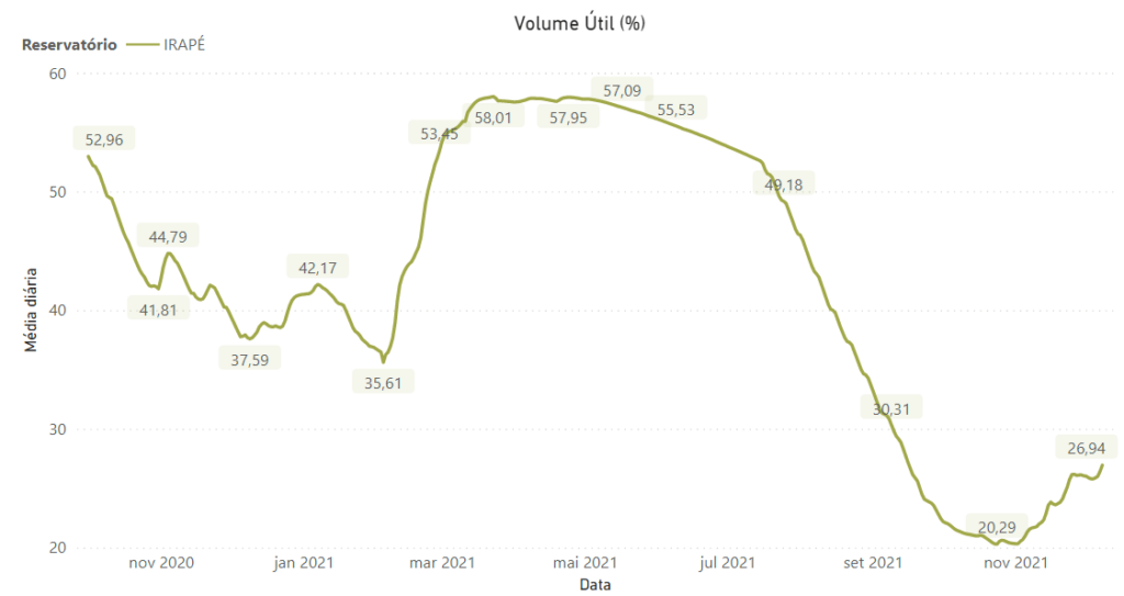Ao longo de 2021 o reservatório da UHE Irapé foi utilizado para atendimento à demanda de energia do Sistema Interligado Nacional, tendo atingido um armazenamento mínimo de 20,29% no final de novembro, conforme gráfico a seguir.