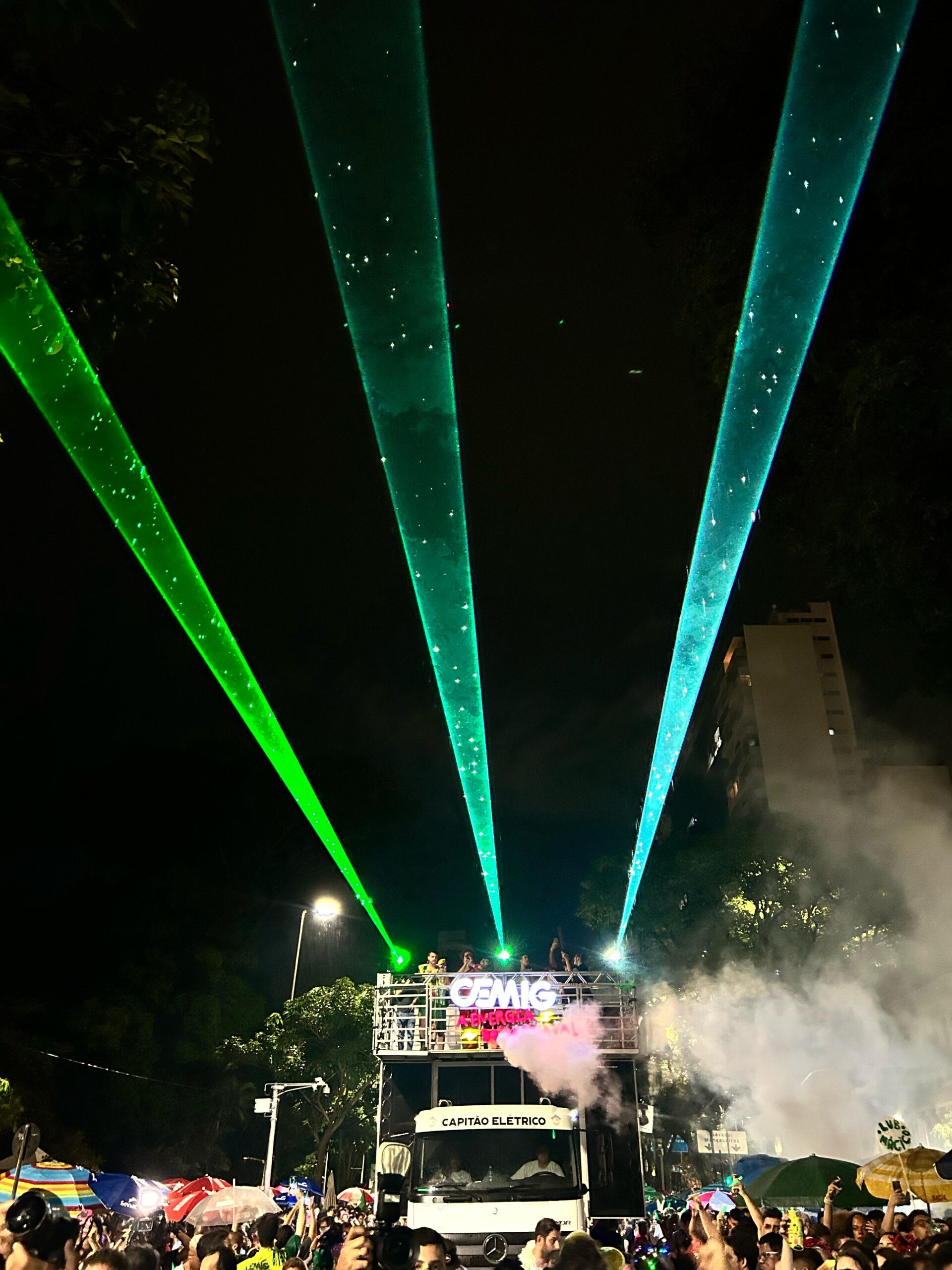 Ele também enfatizou o ineditismo do projeto e a beleza que a iniciativa trouxe para as ruas de BH durante a folia. “Foi a primeira vez que desenvolvemos algo assim. Foi pensado para esse momento. Foram seis máquinas distribuídas em cada lado do trio, de maneira que os feixes ficaram por cima de todo o público, alcançando centenas de metros de distância”, resumiu.