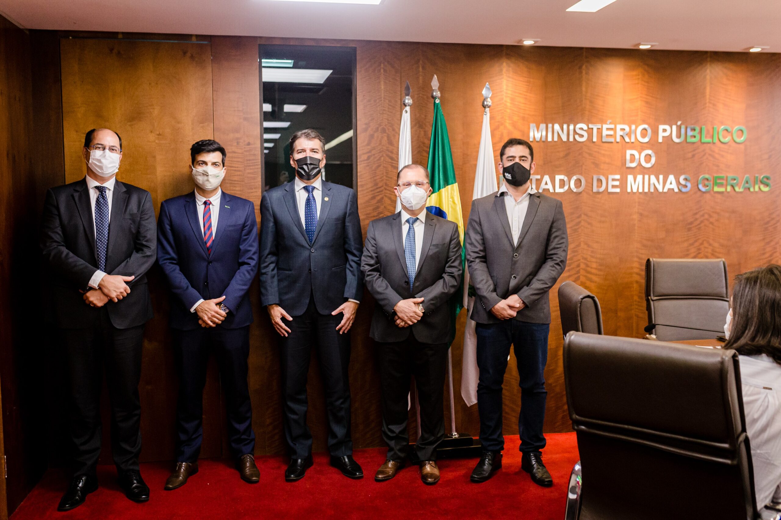 Foto 1: Da esquerda para direita, Hudson Félix Almeida, diretor-adjunto de Gestão de Pessoas e Serviços da Cemig, Thadeu Carneiro da Silva, diretor da Cemig Geração e Transmissão, Jarbas Soares Júnior, procurador-geral de Justiça, Reynaldo Passanezi Filho, presidente da Cemig, e Júlio Gomes do Val, superintendente de Engenharia e Arquitetura do MPMG.