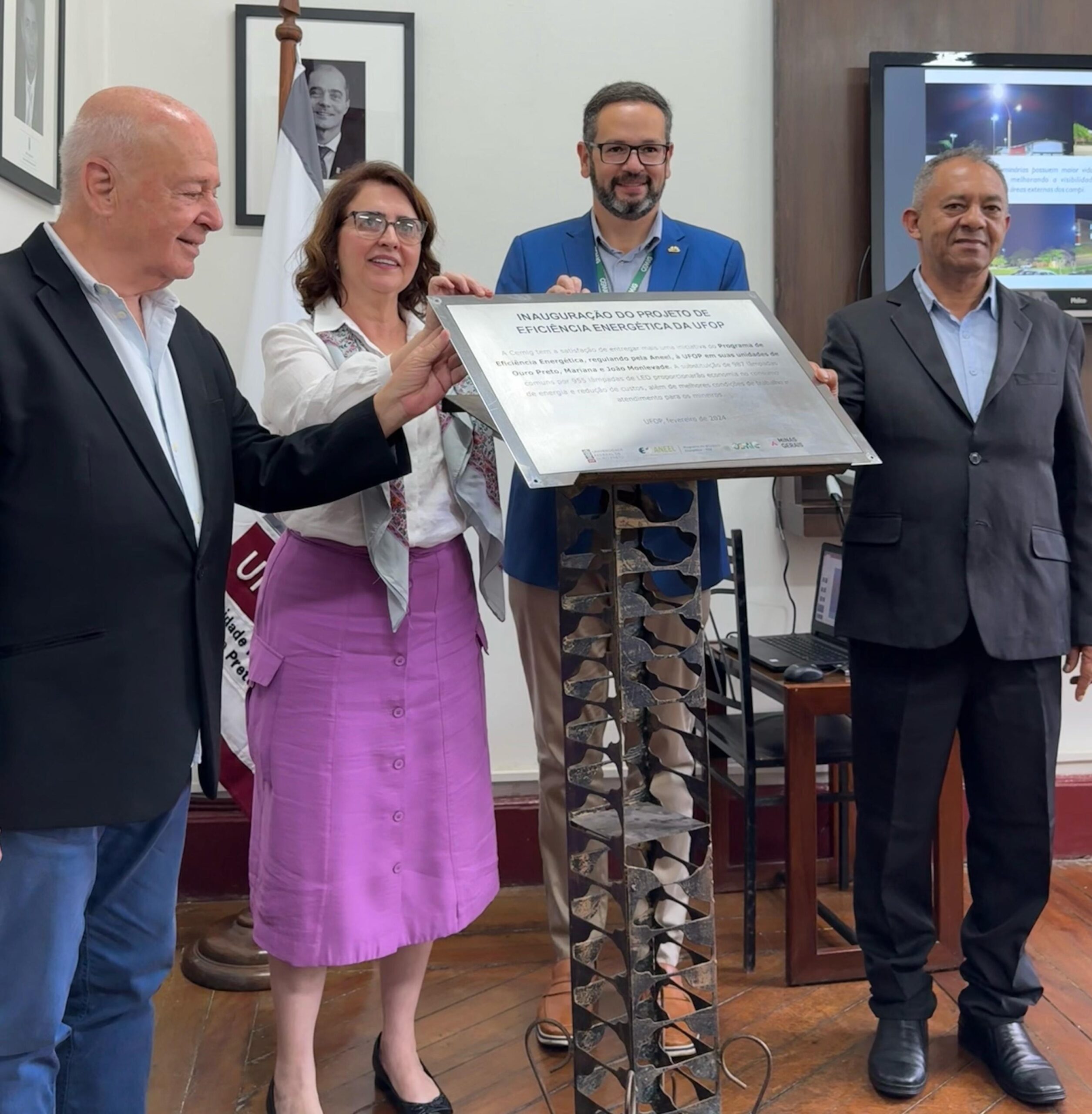 Legenda: O prefeito de Ouro Preto, Ângelo Oswaldo, a reitora da UFOP, Cláudia Marliére, o gerente de EE da Cemig, Ronaldo Lucas Queiroz e o presidente da Câmara Municipal de Ouro Preto, José Geraldo Muniz, participaram da entrega da eficientização da iluminação dos campi da universidade.
