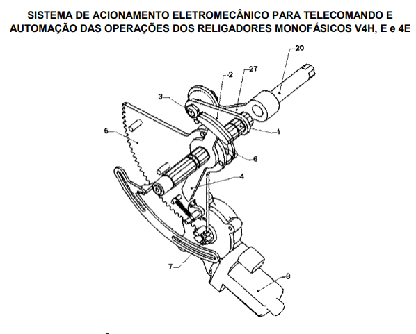 “SISTEMA DE ACIONAMENTO ELETROMECÂNICO PARA TELECOMANDO E AUTOMAÇÃO DAS OPERAÇÕES DOS RELIGADORES MONOFÁSICOS V4H, E E 4E”, a presente patente de invenção consiste em um sistema de acionamento, especificamente um conjunto eletromecânico que tem a função de ser a interface entre o religador e o sistema eletrônico de controle do religador, possibilitando que as funções do religador, modelos V4H, 4H, E e 4E, possam ser acionadas através de dispositivo eletrônico conectado eletricamente ao conjunto eletromecânico. O sistema de acionamento eletromecânico é instalado nos religadores monofásicos e tem como função servir de interface e permitir a operação do religador à distância.